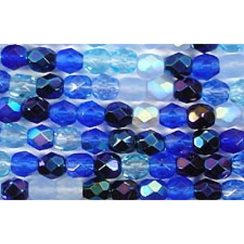 Beadmaking in Czechoslovakia, now Czech Republic has been a traditional craft for centuries. The area known as Bohemia has given its name to the Bohemian Beads. Fire polished faceted glass is made when the pressed crystals are reheating until the glass starts to melt so any sharp edges are fused smooth.CG-305, 100 Firepolish Glass Beads 4mm Blue Mix