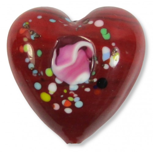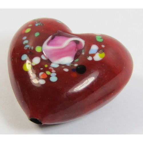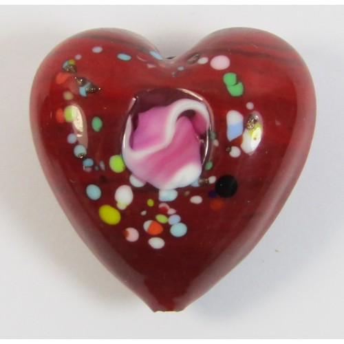 1 Murano Deep Red with Rose Heart with multi coloured speckles design to one side only this is a lovely focal heart. Measures approx. 30 x 16 mm.