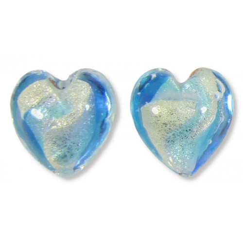 2 Murano Aquamarine/ Periwinkle 14mm White Goldfoiled Hearts white gold foil inside with aquamarine and a touch of perwinkle and a clear crystal casing. Lovely. These beads (also known as Venetian Glass) are handmade on the island of Murano within the Venetian lagoon in Italy. The island of Murano has been dedicated to glass and bead making since the 14th Century. The murano glass artisans are regarded worldwide as the masters of their art.