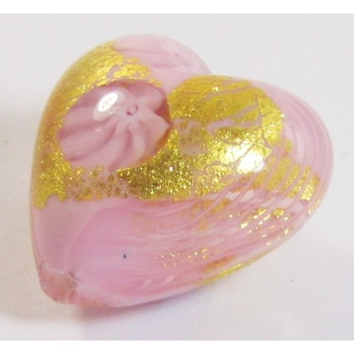 1 Murano Latticino Millefiore Heart – Rose/ 24kt Gold – delicate rose wrapped with 24kt Goldfoil latticino and millefiore detail. Hole runs top to bottom through the heart heart measures approx. 20 x 15 mm.