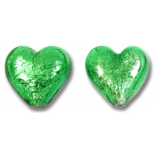 MU-1412, 2 Murano Glass Silverfoil Emerald 14mm Heart Beads