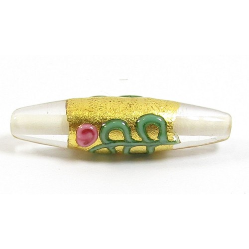 Clear Glass Long Bead with White Lining with Goldfoil Band and Flower Detail, approx 24mm long x 7mm diameter.
