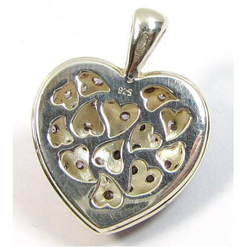 1 Sterling Silver and Lavender CZ Heart Pendant - the reverse is as pretty as the front as it is pieced with cut-out hearts - the front is studded with lavender colour Cubic Zirconium - nice heavy pendant which measures approx. 30x22x9mm inclusive of the hanging bail.