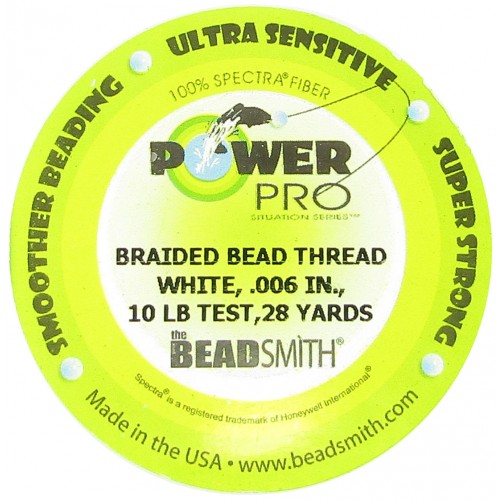 1 Reel of Power Pro braided bead thread white 10lb test .006mm. (28 yards/ 25.6metres/ 84feet.) very strong flexible and prewaxed braided thread. Feels and works better than the finest bead thread but as strong as jewellery wire.