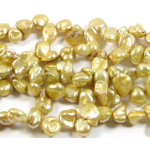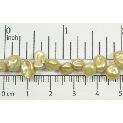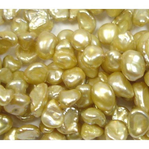 Cultured freshwater pearls are farmed from Mussels almost exclusively in the Far East. The mussels are hand nucleated and the pearl grown for upto 2 years. The pearls are dyed if required, then drilled, polished and strung. All of our pearls are drilled with small holes ranging from 0.3 to 0.6mm, necklaces and are traditionally strung onto silk with knots between each pearl, but fine wire or stringing is equally suitable.FW-360, 1 Strand Wheat Pale Gold Keshi Cornflake Freshwater Pearls