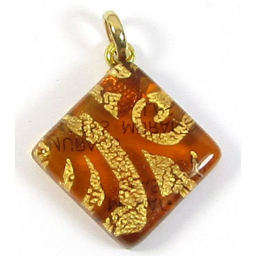 Italian Glass Diamond Pendant with hanging bail - with Made In Murano motif on the back to ensure authenticity; comes complete with certificate of authenticity. Goldfoil swirls on topaz glass base on goldtone bail. Measures approx 27mm across corners.
