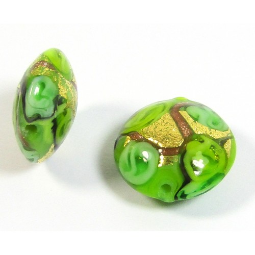 1 Murano Glass Amore Lime Goldfoil & Aventurine 14mm Lentil: Opaque Lime plus flower swirls in shades of green with exposed goldfoil.