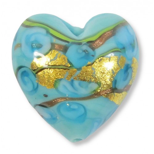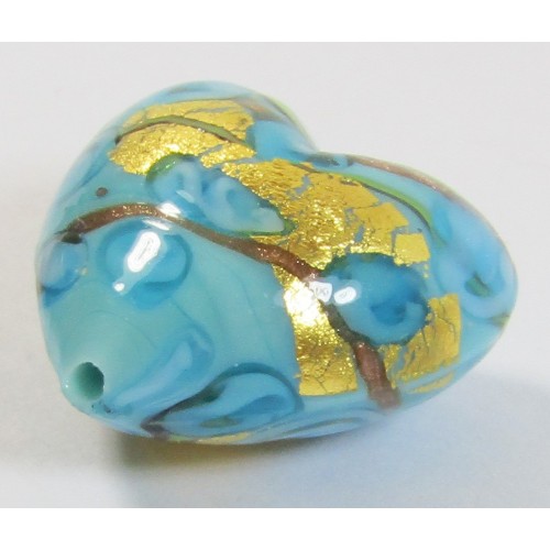 1 Murano Glass “Amore” aquamarine Goldfoil & Aventurine 20mm Heart: Opaque aquamarine base with erba green overlay plus flower swirls in aquamarine with exposed goldfoil.
