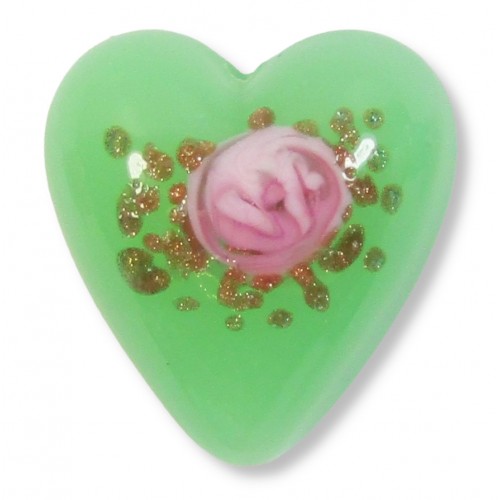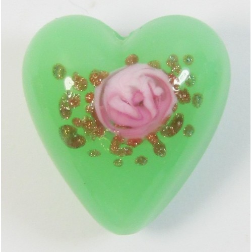 1 Murano Glass Opal Nile Green with Aventurine & Rose Flower 20mm Heart Bead