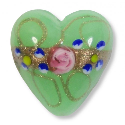 1 Murano Glass Nile Green with Flower and Aventurine 20mm Heart Bead. Opal nile green. aventurine band with rose flower and aventurine decoration. Finished with multicolour dots.