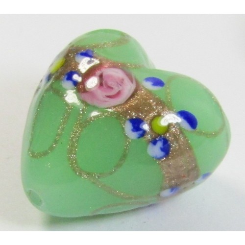 MU-2802, 1 Murano Glass Opal Nile Green with Flower and Aventurine 20mm Heart Bead