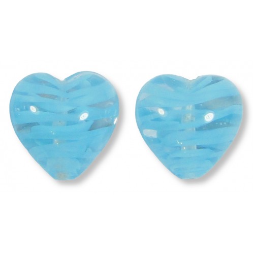 2 Murano Glass Filigrine Light Blue 12mm Heart Beads. Spirals of colour embedded within clear glass.