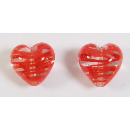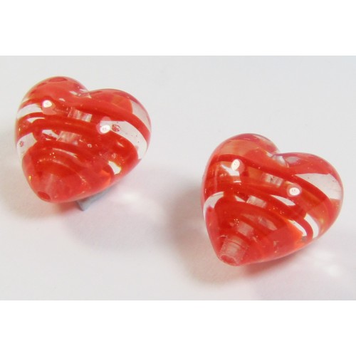 2 Murano Glass Filigrine Red 12mm Heart Beads. Spirals of red embedded within clear glass.