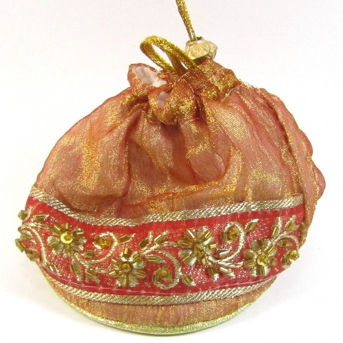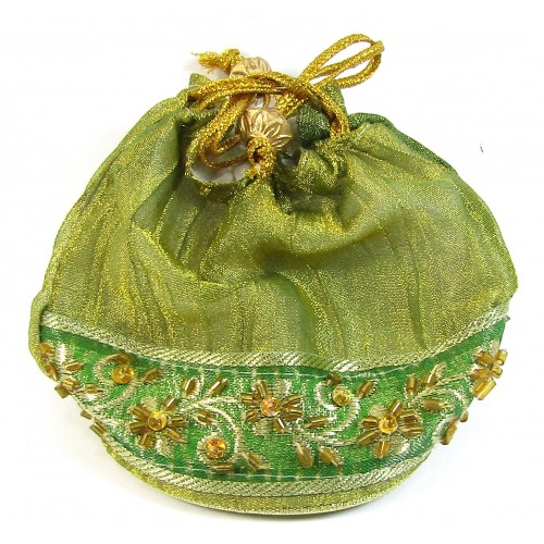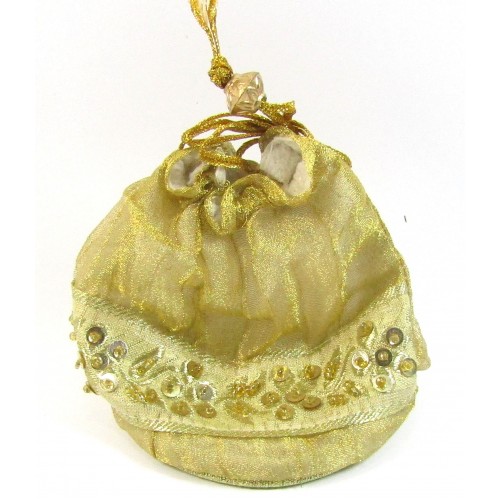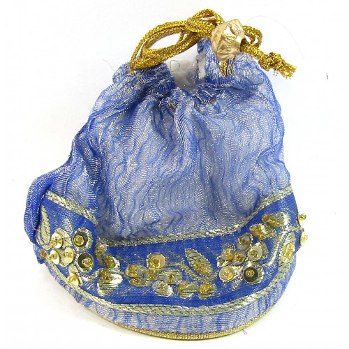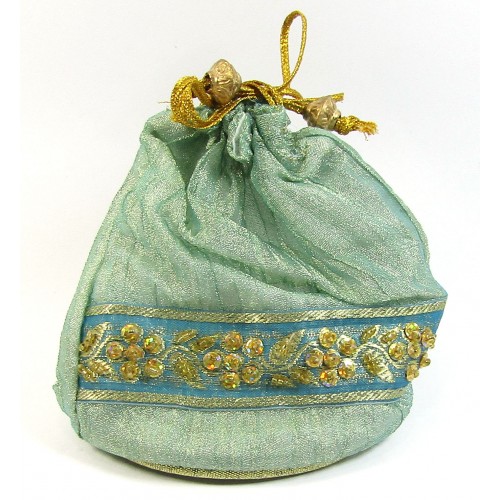 1 Drawstring pouch and flat bottom with internal lining.Ribbon and sequin detail on one side. Internal measurements approx 7cm diameter x 8cm high. In a choice of colours.