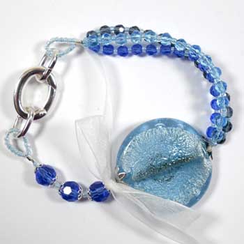 The kit features an organza bag, a handmade silver-lined glass disc bead,
