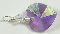 InstructionsMake two heart and Swarovski bead charms; thread your wire through the hole in the heart, wrap the wire twice and cut and neaten. String on your Swarovski bead, make a loop and wrap twice. Cut and neaten Make another wire loop and join to one of the loops on the heart. Wire wrap and neaten. Add beads in this order - Swarovski Cyclamen Opal, sterling spacer bead, Swarovski Light Metallic Gold 5mm Bicone, Swarovski Violet 4mm Bicone, Swarovksi Crystal 3mm Bicone. Wrap another loop, cut and neaten. Straighten so the earrings look neat. Open the earring findings, finish off. |